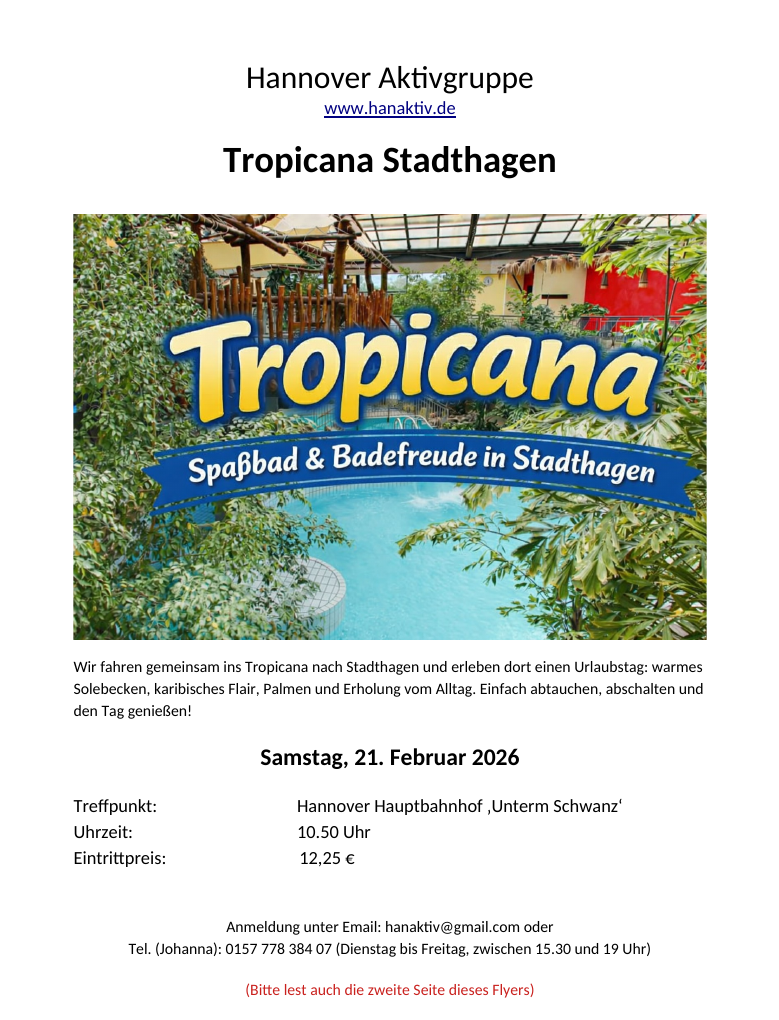 Wir fahren gemeinsam ins Tropicana nach Stadthagen (https://www.tropicana-stadthagen.de/) und gönnen uns Wärme, Wasser und ein bisschen Sommergefühl mitten im Februar.